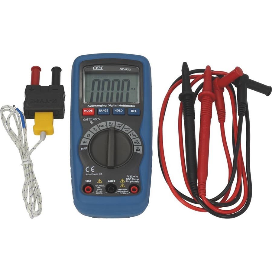Multimètre digital CEM DT-922 BLU idéal pour mesures électriques précises. Polyvalent, fiable et complet avec étui et sondes. Conçu pour usages professionnels en maintenance et diagnostic.